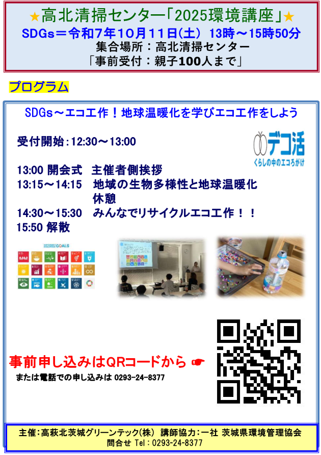 ![]() 「SDGsエコ工作地球温暖化を学びエコ工作をしよう」を開催します。 開催日 令和7年10月11日(土) 受付時間 12:30〜13:00 開催時間 13:00〜15:50 事前受付のみ100組の参加になりますので、ご了承ください。 詳しくは、上記内容を確認ください。 皆様のご来場を心よりお待ちしています。 |